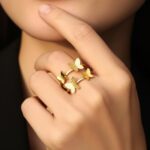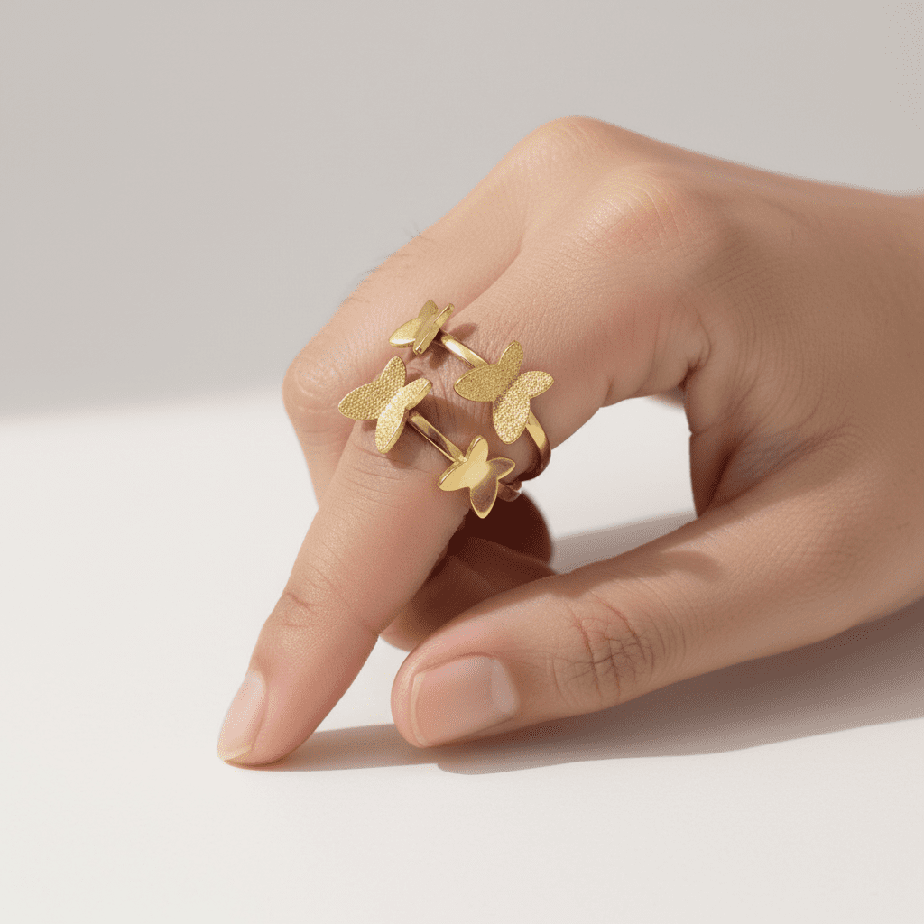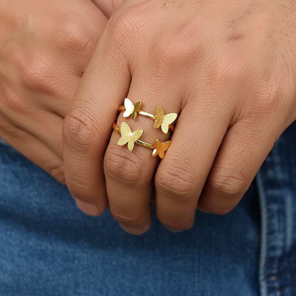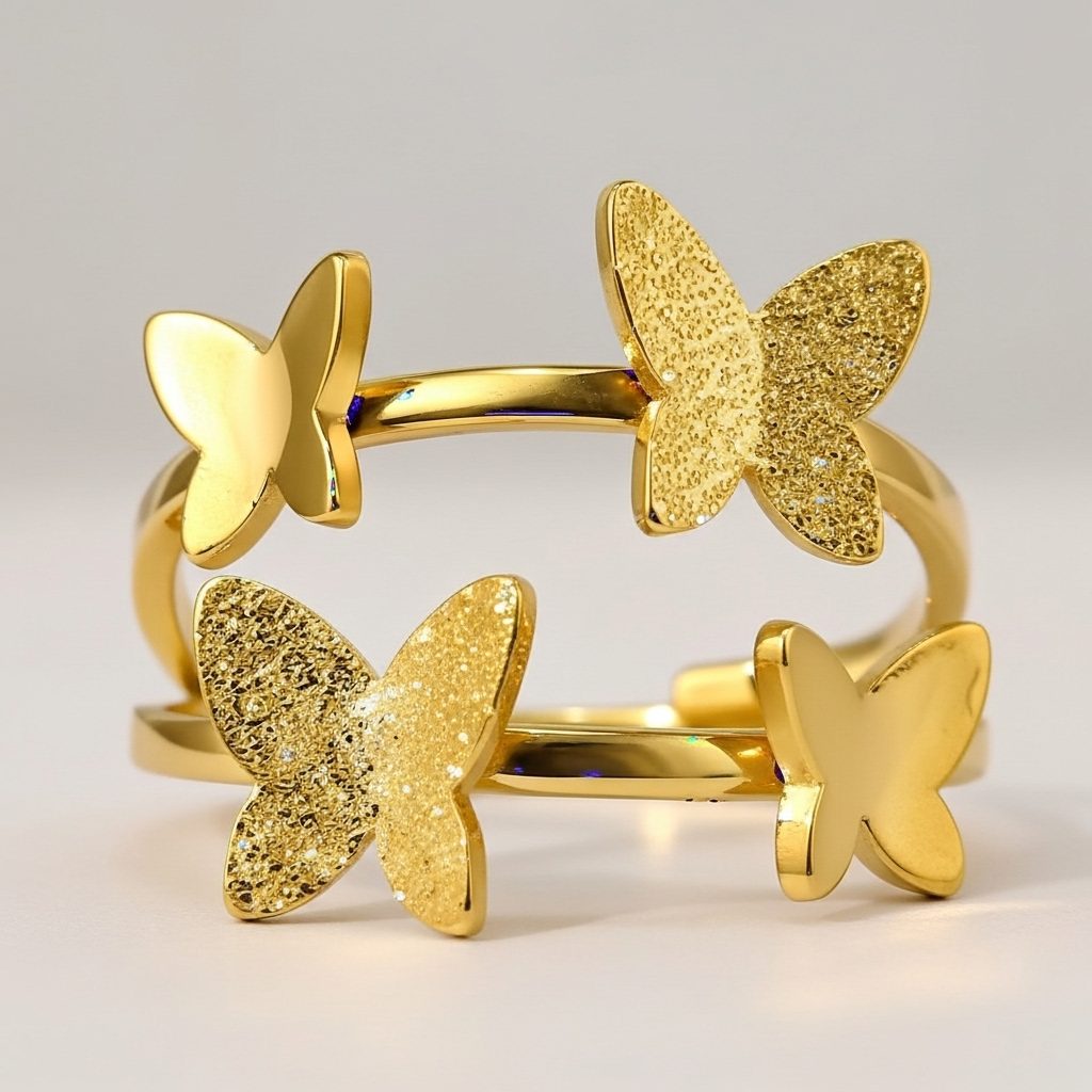 This charming gold butterfly double women’s ring features two delicate butterfly motifs with sparkling glitter-textured wings connected by a sleek curved band. Crafted from high-quality stainless steel with premium gold plating, it is corrosion-free, fade-free, and durable for enduring shine. Its whimsical yet refined design offers lightweight comfort ideal for daily wear or adding playful elegance to special occasions.