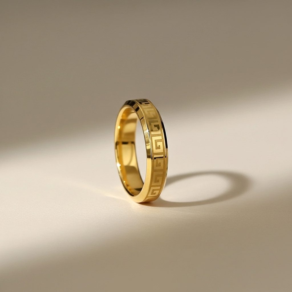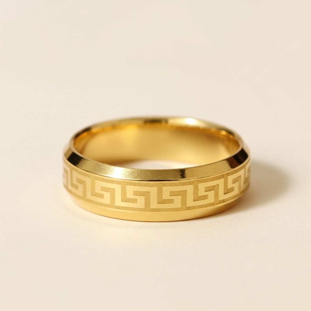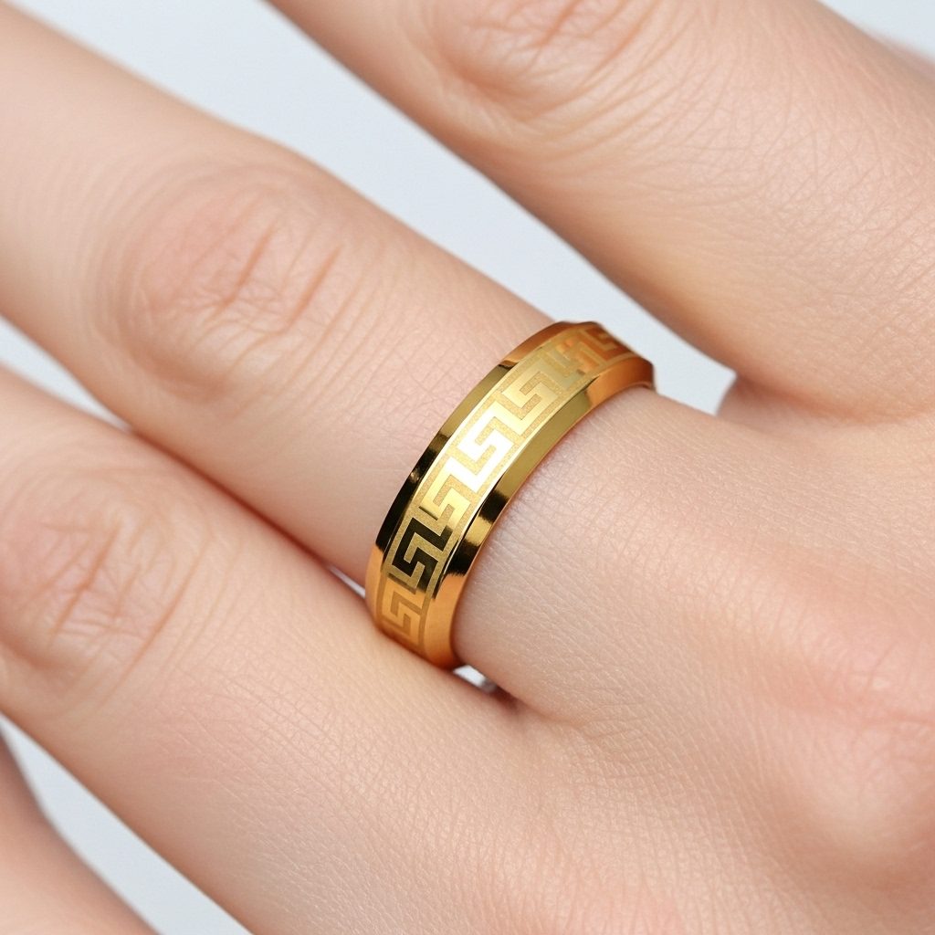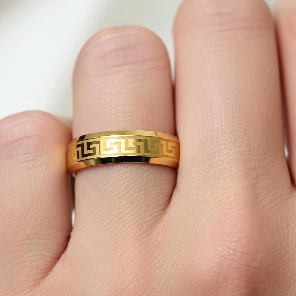 This elegant gold greek key women’s ring showcases a timeless geometric meander pattern etched around high-quality stainless steel with luxurious gold plating. Corrosion-free, fade-free, and built for lasting durability, it offers a polished finish that’s comfortable for daily wear or special occasions. The classic design brings modern sophistication to any look in just the right minimalist way.
