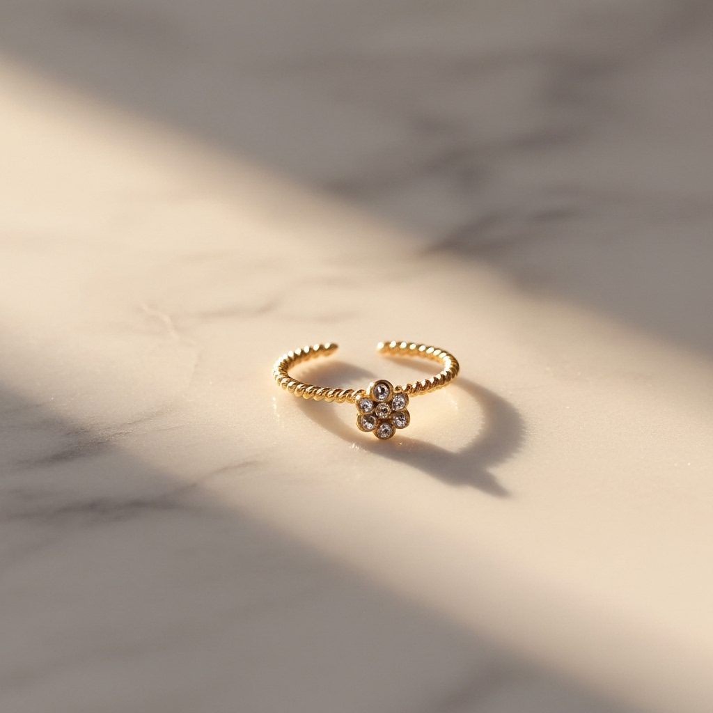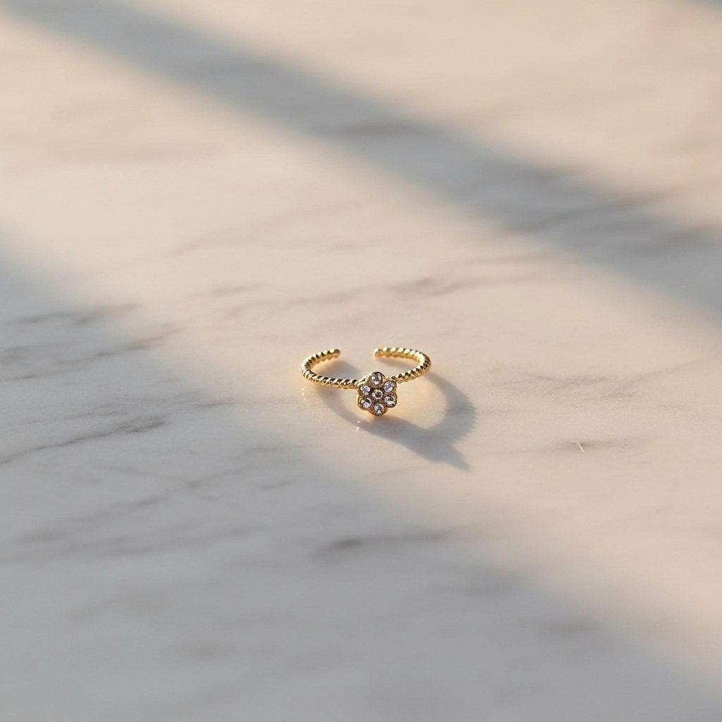 This elegant gold diamond flower twisted nose ring showcases a delicate floral cluster of sparkling diamonds set atop a slim open band for timeless femininity. crafted from high-quality stainless steel with a luxurious gold finish, it remains corrosion-free, fade-free, and durable for effortless daily comfort. perfect for adding subtle sophistication and gentle sparkle to both everyday wear and special occasions.