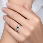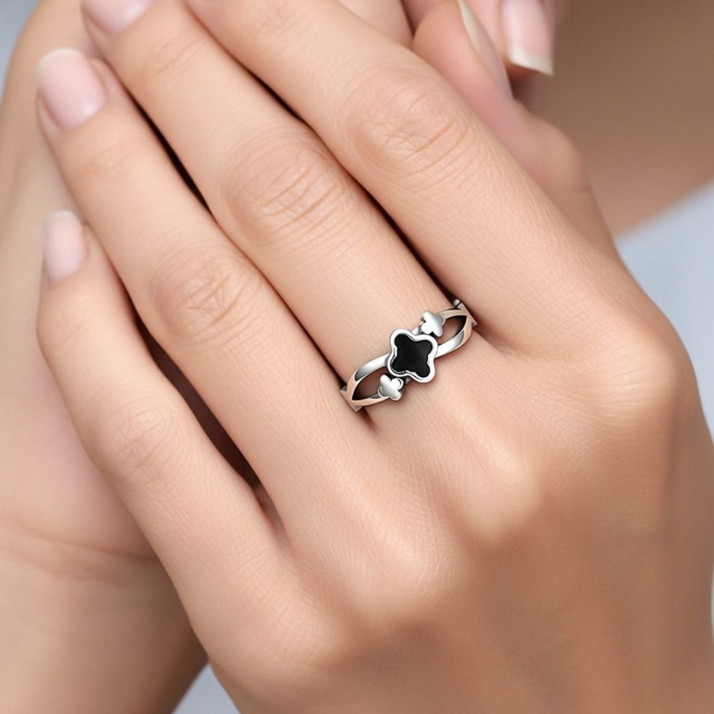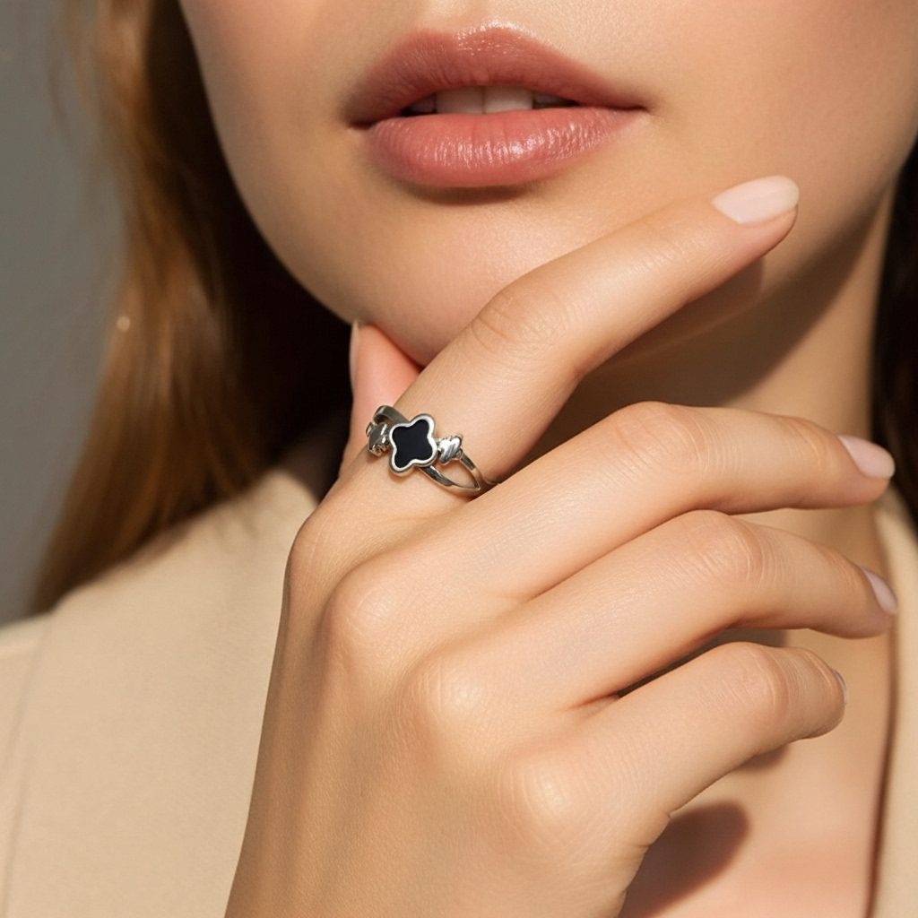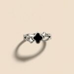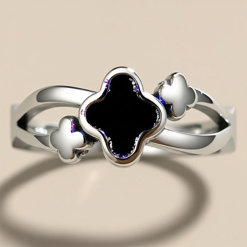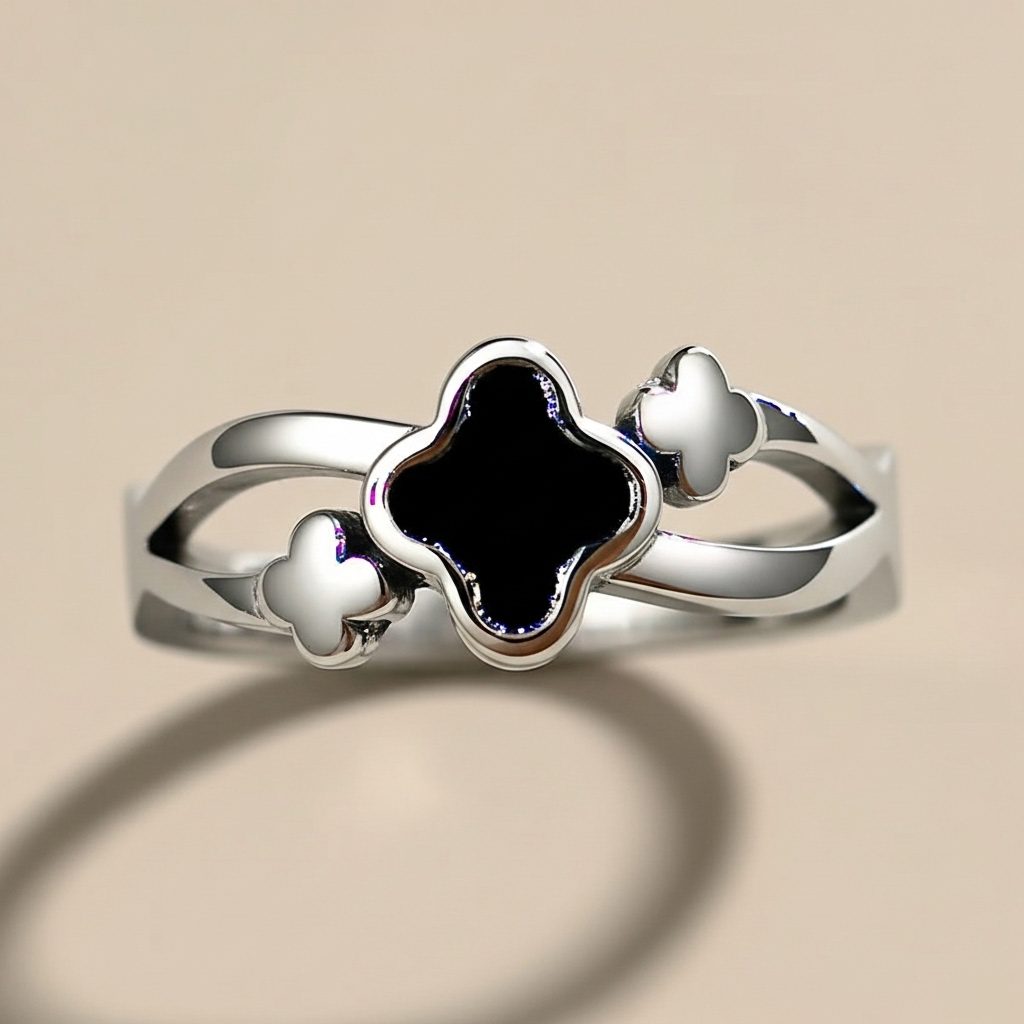 This silver stainless steel clover ring features a modern cut-out band design with alternating black and white enamel clover motifs. Crafted from high-quality stainless steel, this durable piece is corrosion-free and fade-free to maintain its fashionable polished shine over time. Its minimal and sleek aesthetic makes it a perfect choice for both daily wear and special occasion wear.