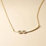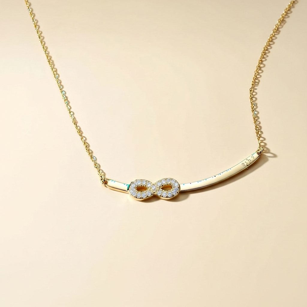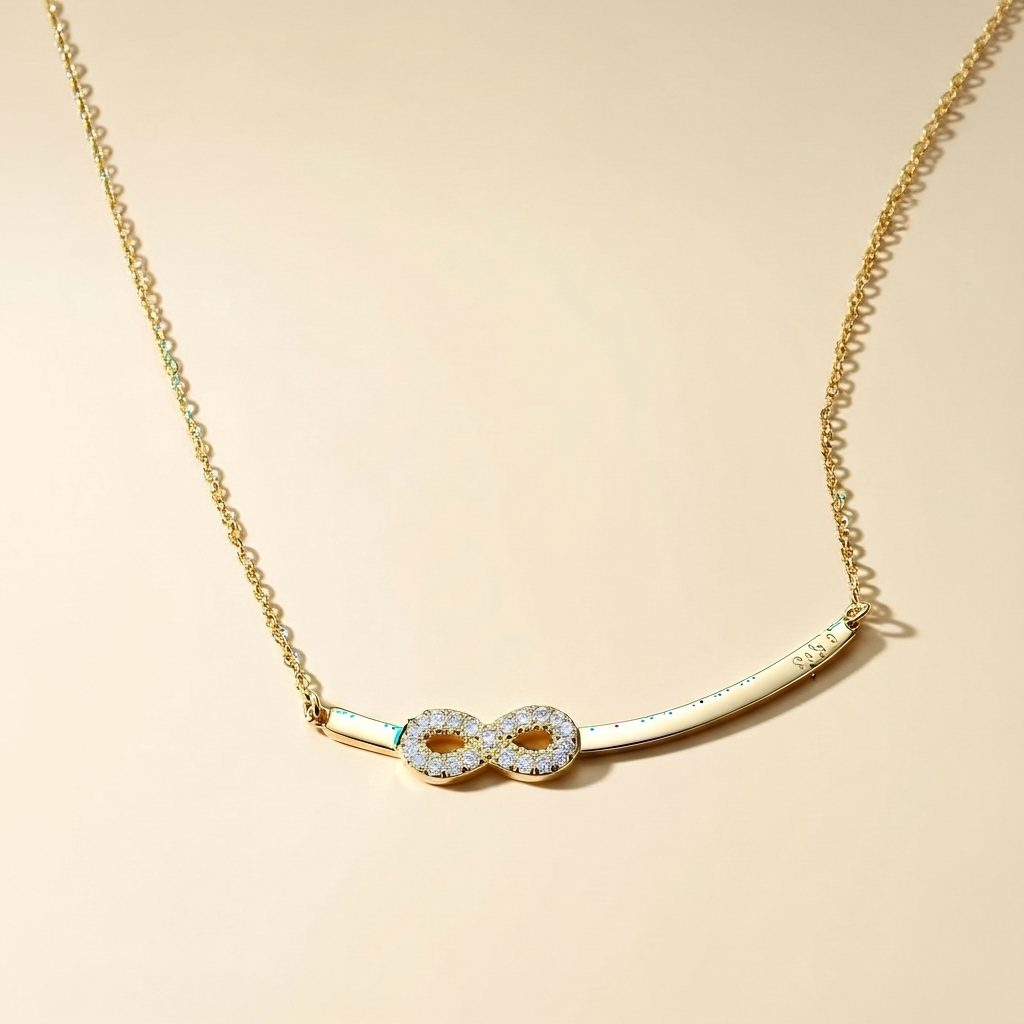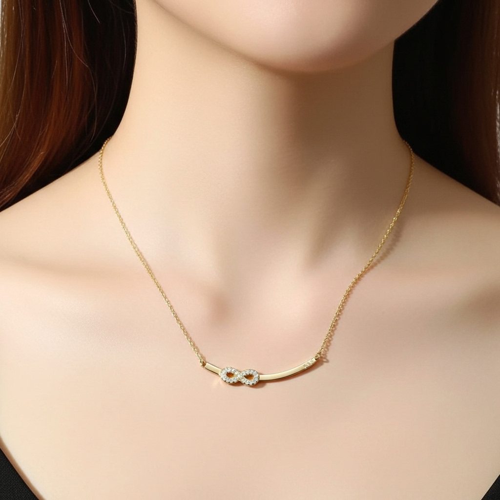 This women’s infinity bar necklace in stainless steel showcases a sleek curved bar design accented by a sparkling cubic zirconia infinity symbol for a modern minimalist look. Crafted from high-quality stainless steel, it offers corrosion-free, fade-free, and durable wear perfect for daily elegance or special occasions. The polished gold-tone finish and delicate chain ensure comfortable all-day sophistication with timeless appeal.